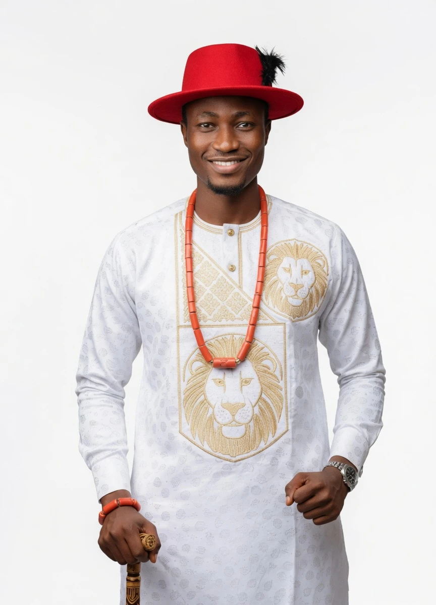 Redefine elegance with this premium men’s white senator outfit, designed for modern African royalty. Crafted from high-quality fabric, this outfit features intricate gold lion embroidery—symbolizing strength, leadership, and prestige—making it a standout piece for distinguished occasions.
